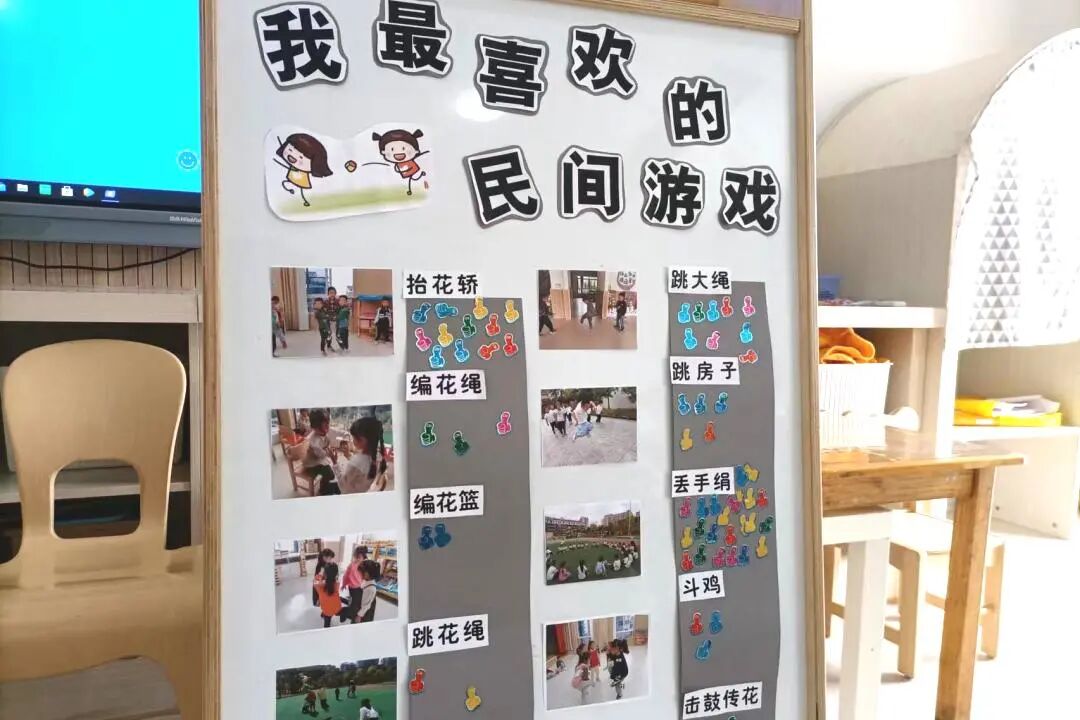 在一系列的民俗游戏后,我们展开了一次大统计。以统计的形式向幼儿发起投票能够提高幼儿对自己主观思想的判断,也能更加直观地反映出孩子们的兴趣所在点,以了解幼儿最喜欢的民间游戏有哪些。