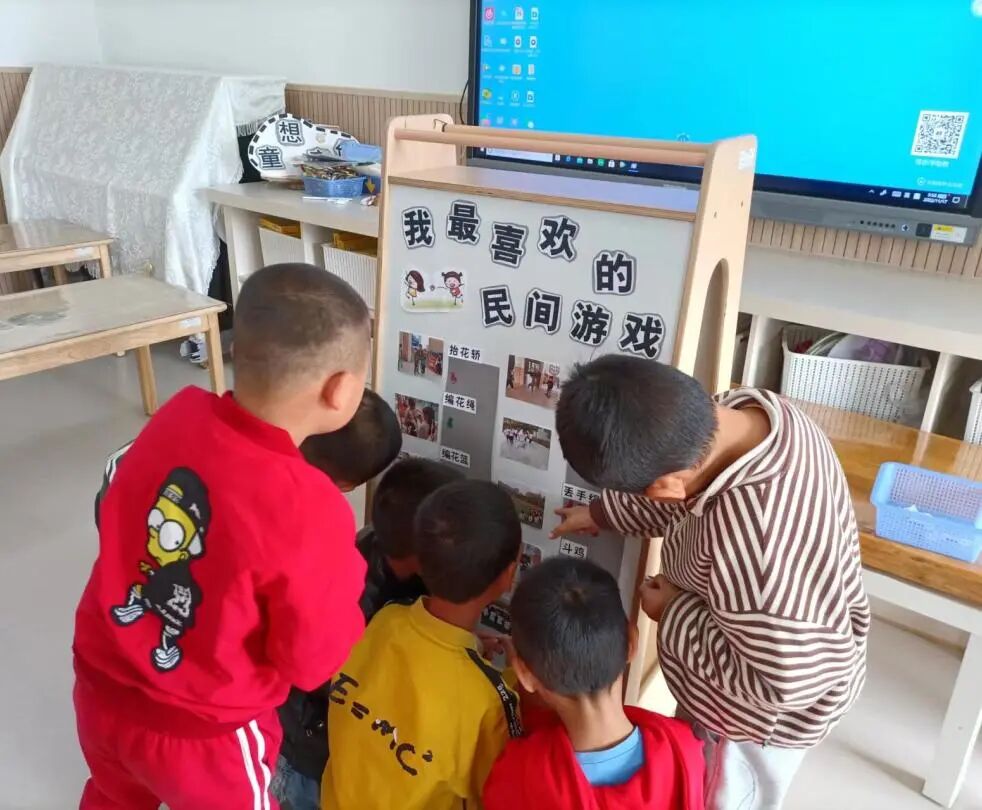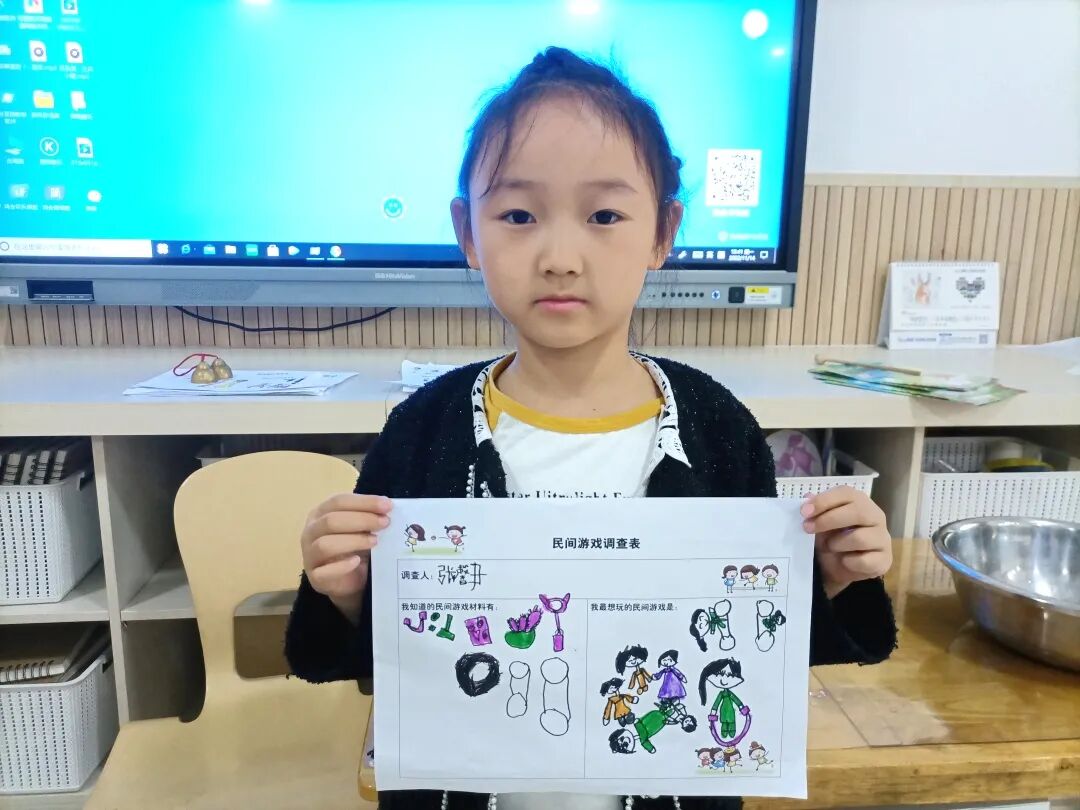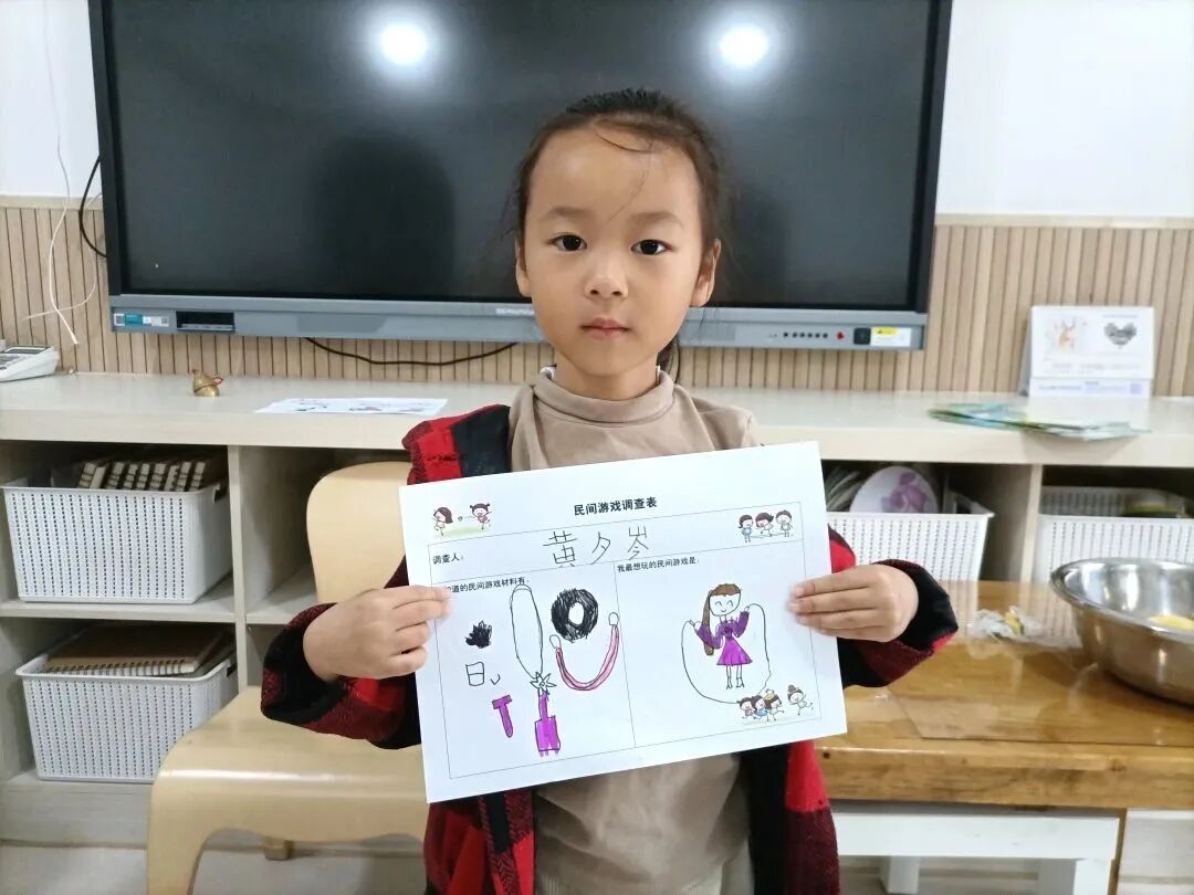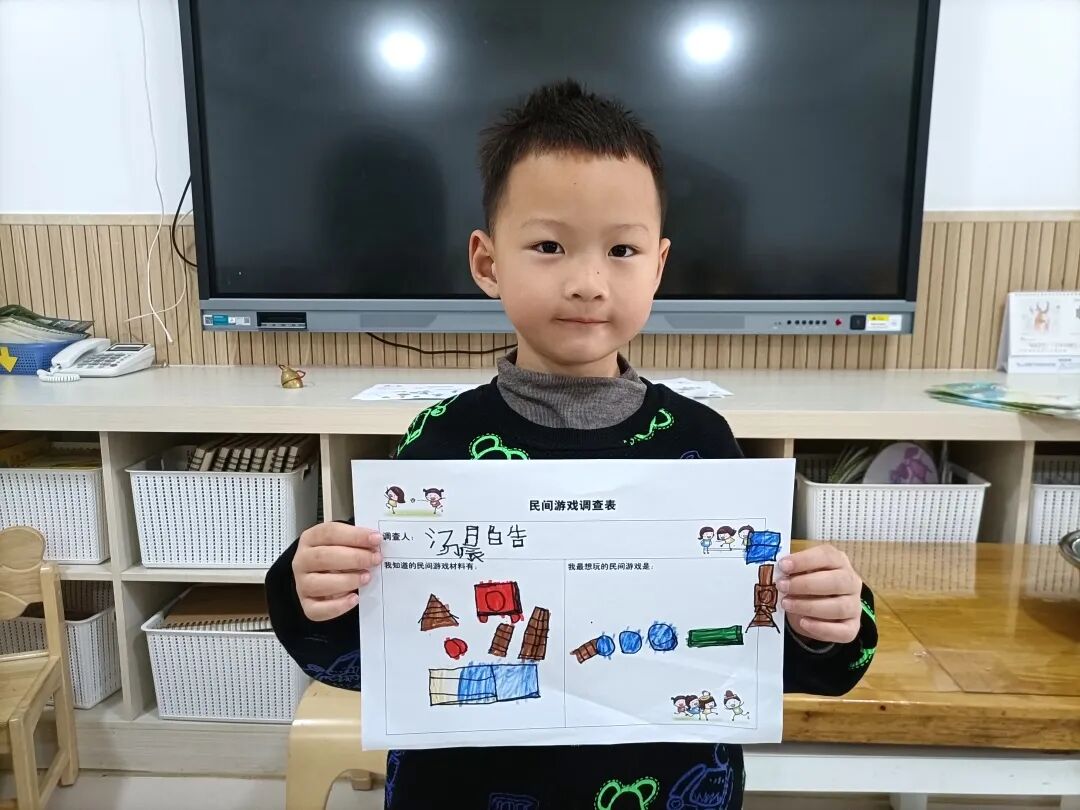 兴趣是幼儿最好的老师,孩子们在你一言,我一语的交流之中,彼此分享着他们所知道的民间游戏材料,以及他们最想玩的民间游戏,一场调查由此展开了……