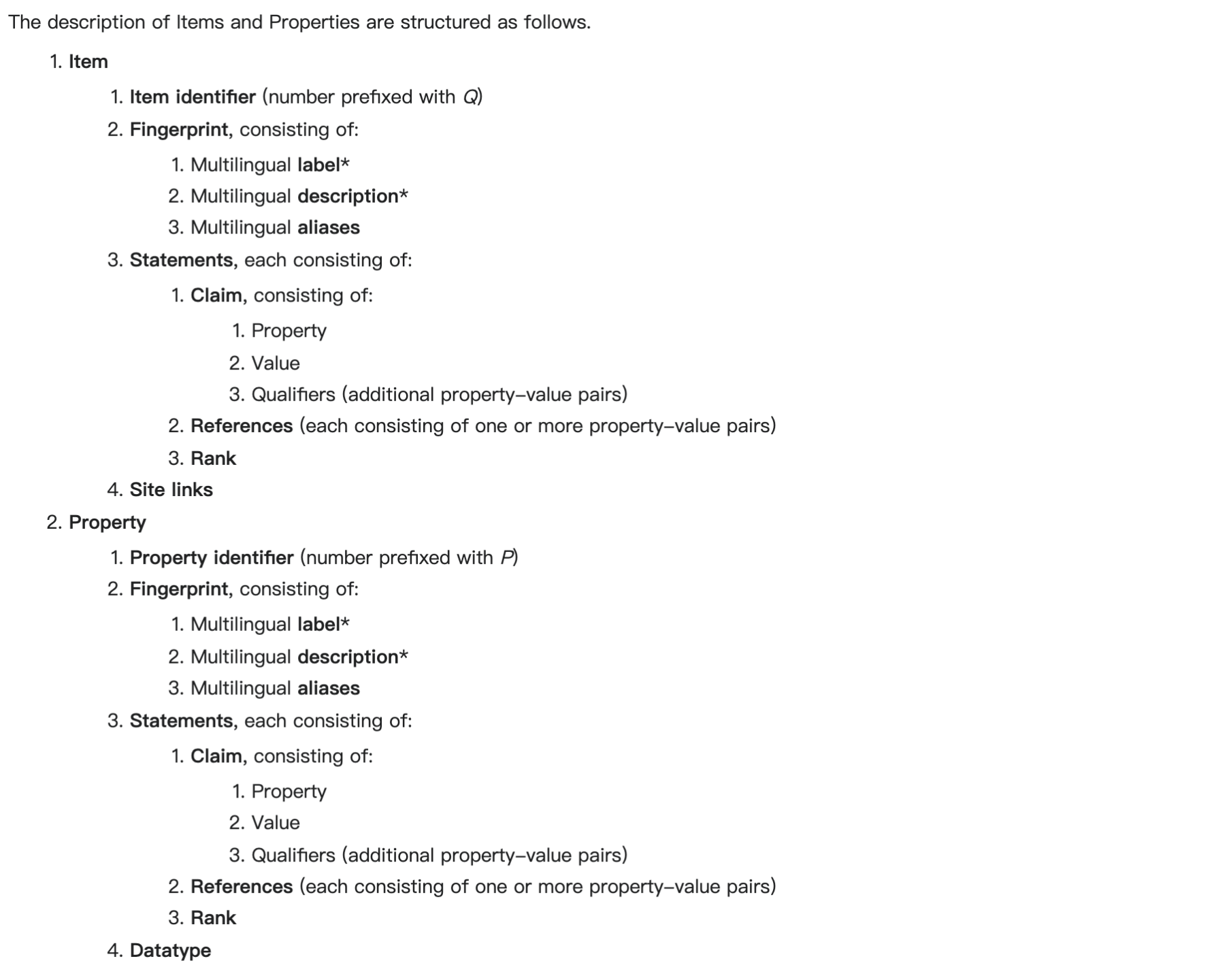 - Item和Property结构基本一致,除了Item具有Site links(站点链接),而Property则具有一个Datatype字段,表明该属性的数据类型。