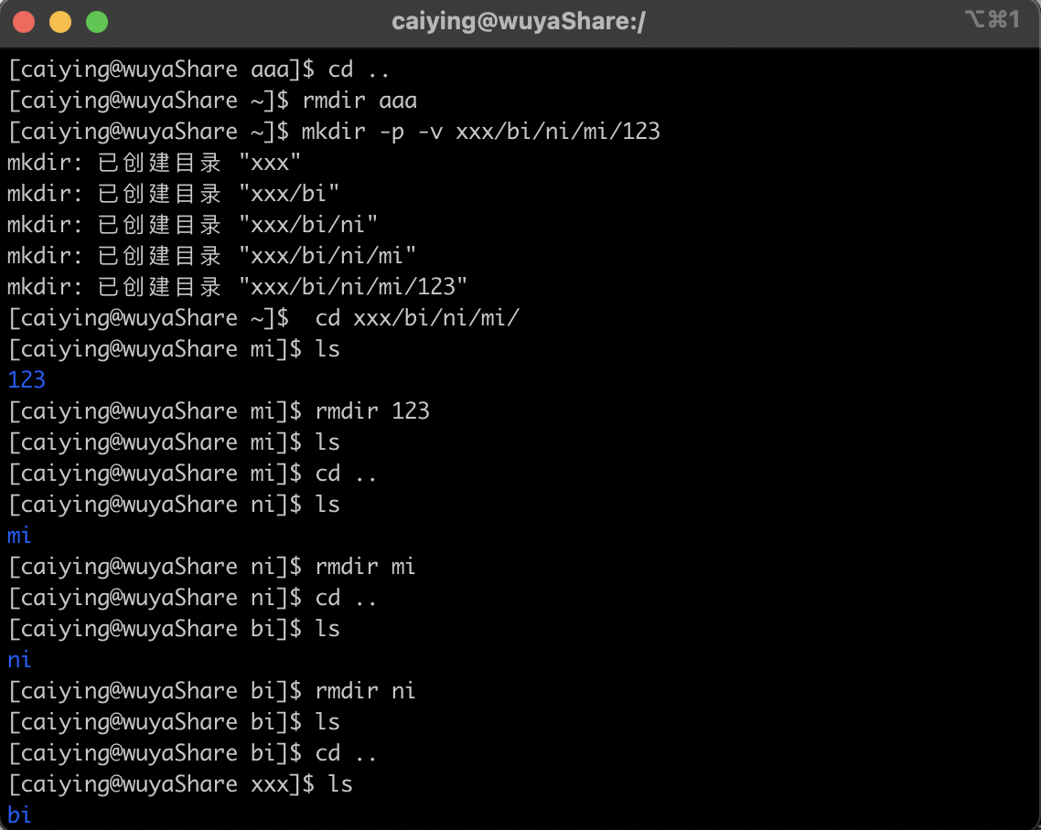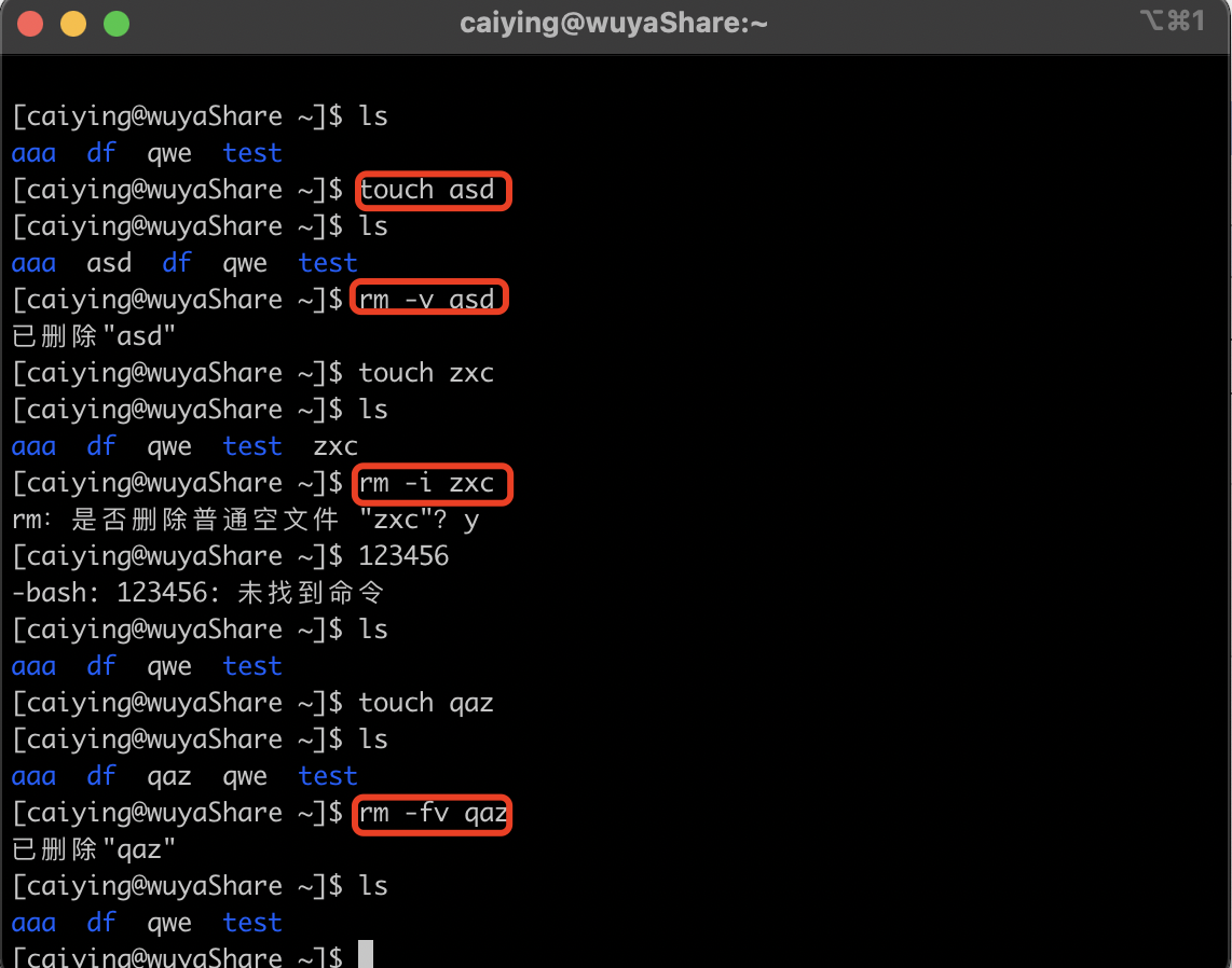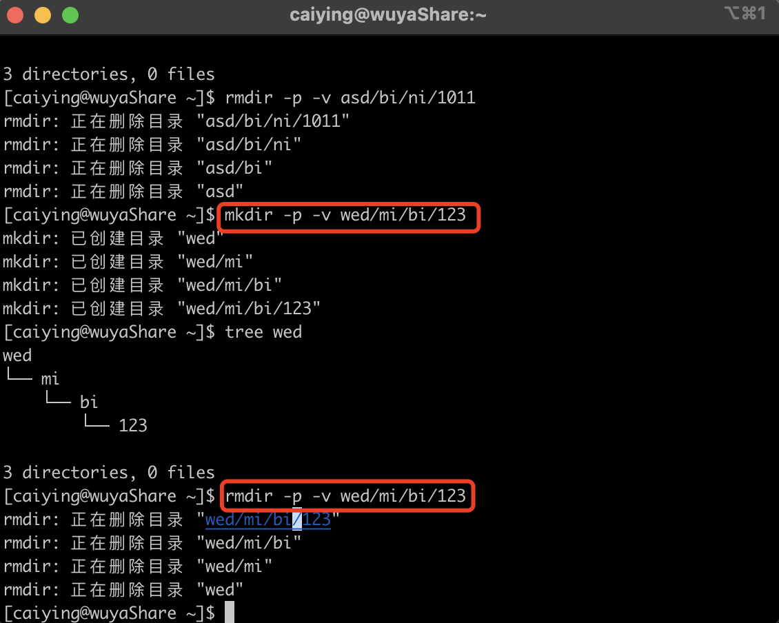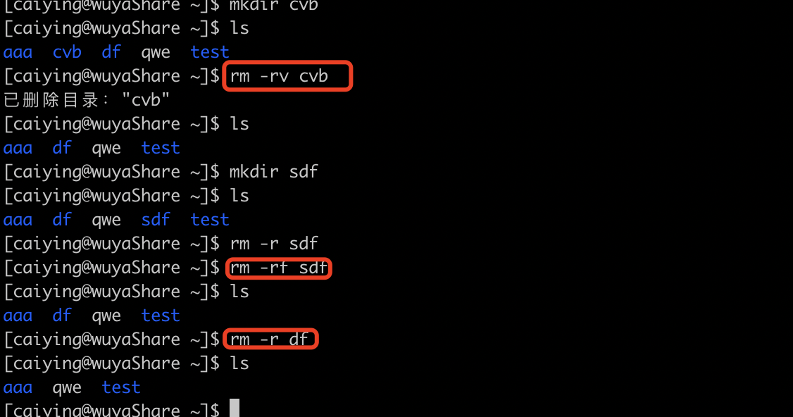 - rm -r 目录名(删除文件时会询问是否删除(root))