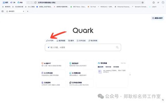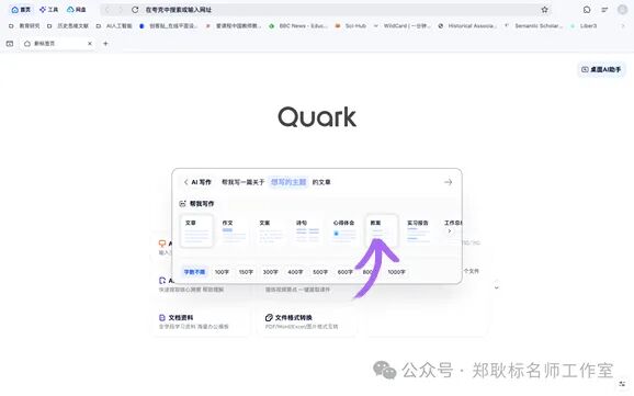 对于有写作需求的朋友们来说,夸克无疑是一个得力助手。你只需要输入主题和字数等要求,它就能撰写近200种类型的文稿,像文章、报告、文案等等。而且速度极快,半分钟就能产出一篇高质量的文章。这大大提高了我们的写作效率,让写作不再是一件头疼的事情 。值得一提的是,这里还有撰写教案的功能。进入主页后,我们点击提问框里面的“AI写作”就会出现相应的体裁的选项。如下图所示: