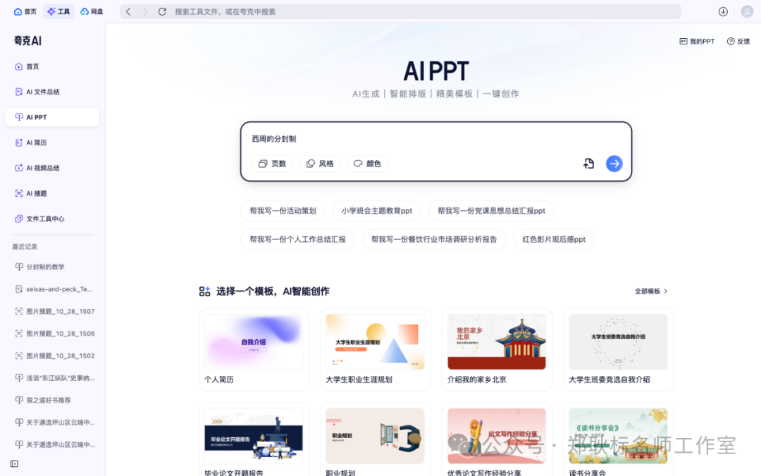 例如,我们输入“分封制”,再选择页数、风格和颜色就可以生成PPT了。