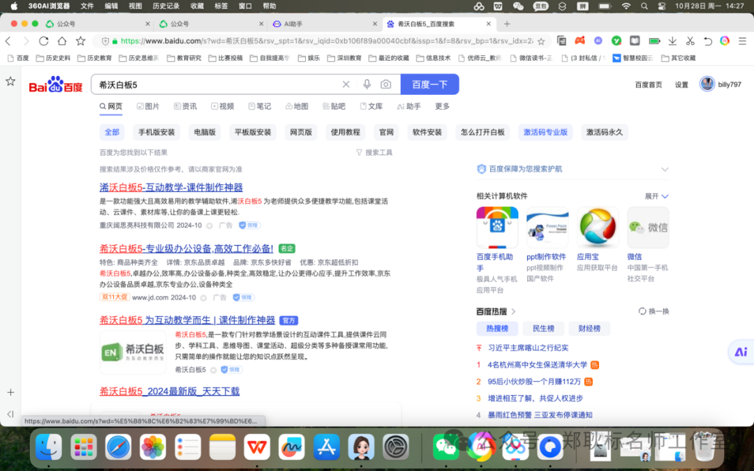 例如,我们要找“希沃白板5”这个软件,如果你到百度一搜,你会发现特别多的广告,一不小心就下载错了。如下图所示,前面两个都是广告,第三个才是官网,许多人不注意看就下错了。