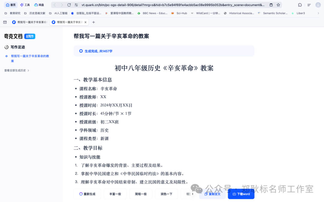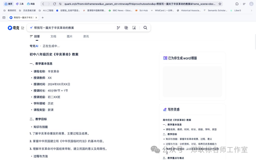 我们试试夸克教案写得怎么样,输入“辛亥革命”看看。夸克先搜索一番后,给我们呈现了一个教案,如下图所示: