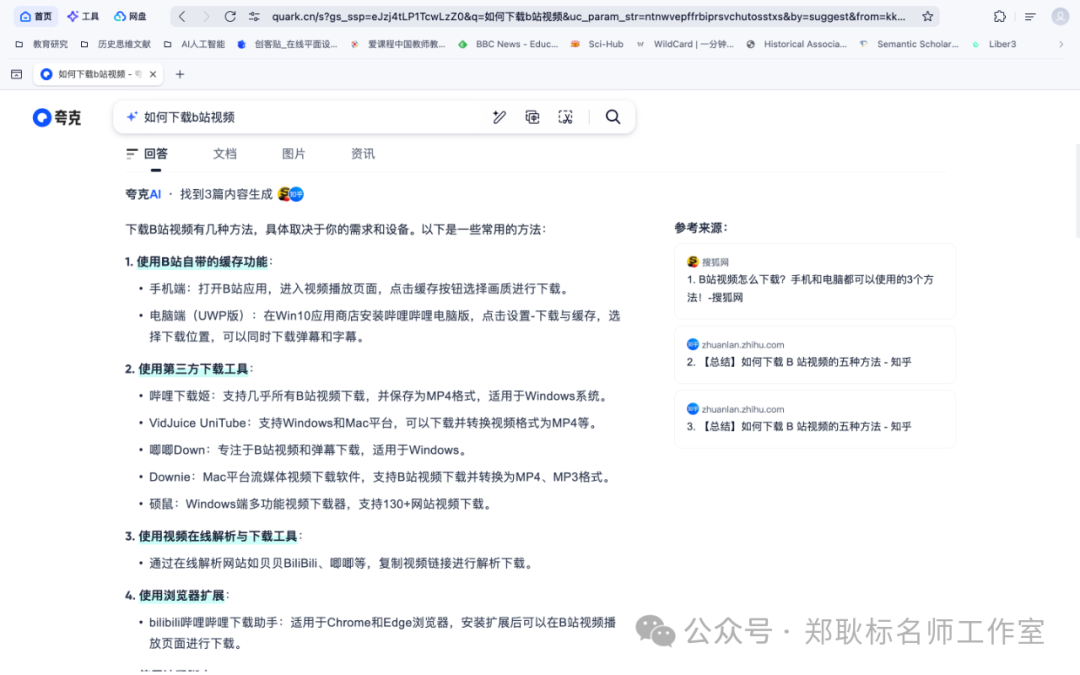 我们可以提问任何问题,它都会智能为我们搜索网页并总结回答。例如我们提问它:如何下载b站视频?它会直接搜索网页,形成答案。例如这里它参考了3个网页,生成了下面的答案。