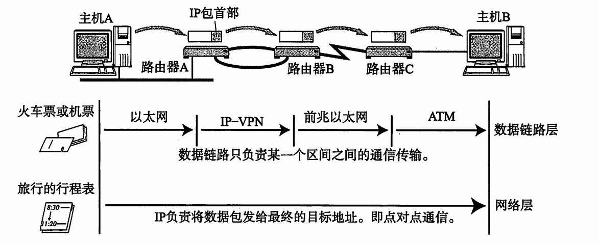 如果我们只有行程表而没有车票,就无法搭乘交通工具到达目的地。反之,如果除了车票其他什么都没有,恐怕也很难到达目的地。因为你不知道该坐什么车,也不知道该在哪里换乘。因此,只有两者兼备,既有某个区间的车票又有整个旅行的行程表,才能保证到达目的地。与之类似,计算机网络中也需要数据链路层和网络层这个分层才能实现向最终目标地址的通信。