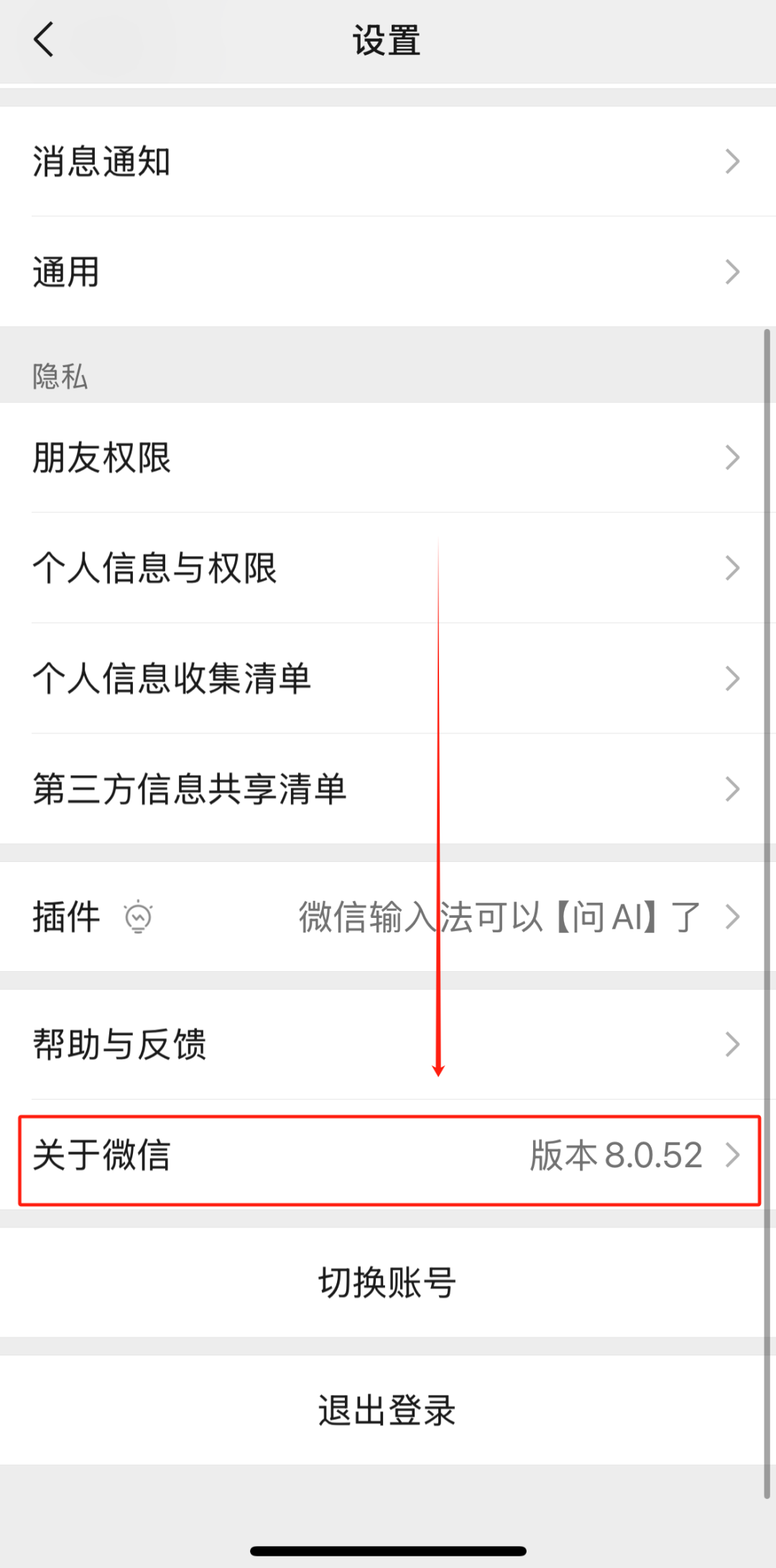 iOS系统手机,打开微信,在“我的”—“设置”,点击底部“关于微信”。