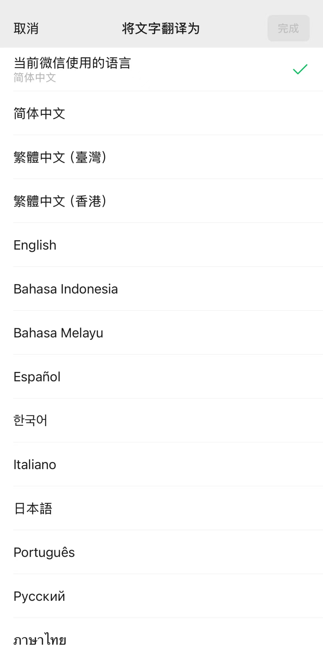 小程序翻译能力支持简体中文、繁体中文(台湾)、繁体中文(香港)、英语、印度尼西亚语、马来语、西班牙语、韩语、意大利语、日语、葡萄牙语、俄语、泰语、越南语、阿拉伯语、土耳其语、德语、法语共 18 种语言。