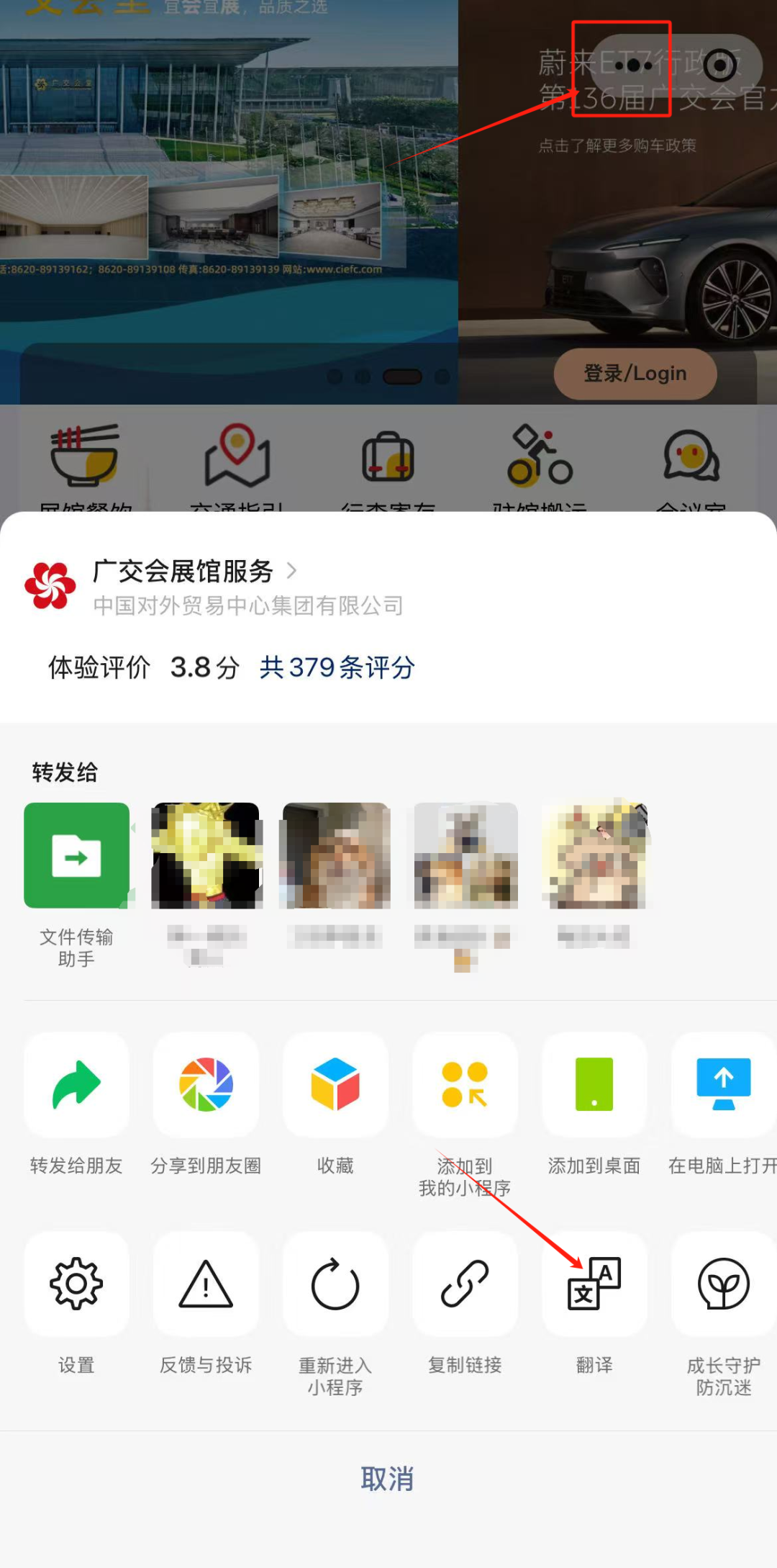 以”广交会展馆服务小程序“为例,点击右上角“…”,点击【翻译】
