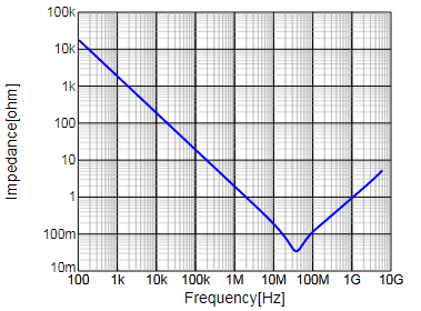 上图是某100nF贴片陶瓷电容的特性,“V”字底部对应为谐振频率,谐振频率大概是20Mhz左右。