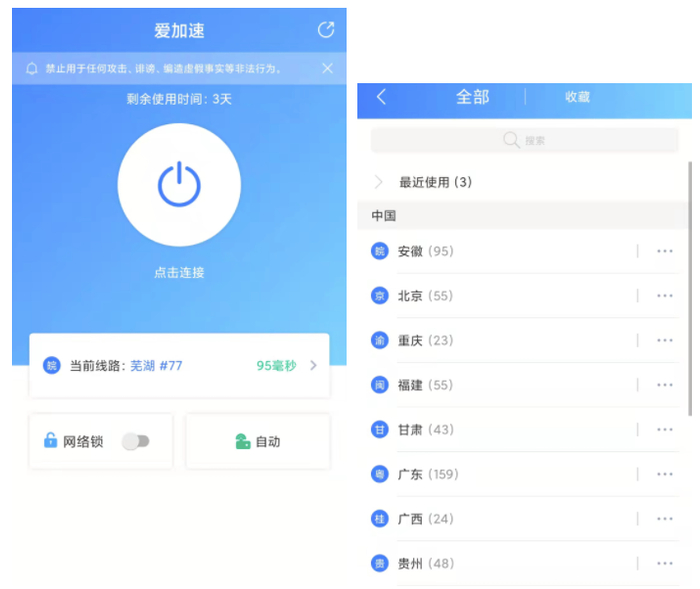 随后,红星资本局花费9元购买了上述服务器。按照商家给出的教程,红星资本局下载了一款名为“爱加速”的APP,注册登录后发现,可以将手机的“IP属地”修改为目标地区的IP地址,国内所有省市的地址均可用。