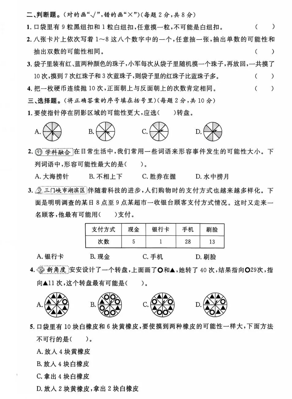 4、考查可能性,根据事件发生的确定性和不确定性进行分析:
