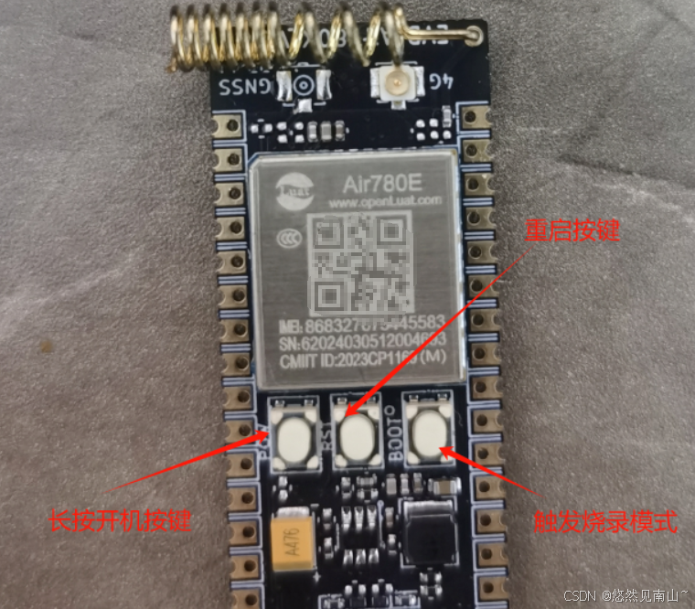 - 当我们模块开机时,按着BOOT键然后点按重启键即可。