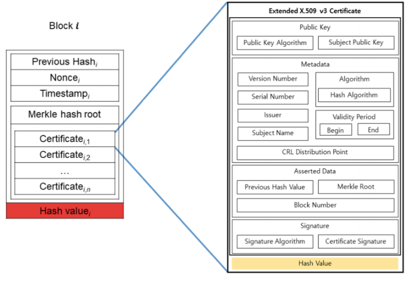 Yakubov等人在2018年提出了基于区块链的PKI管理框架。他们设计了一个基于区块链PKI,用于修改X.509证书。X.509 v3证书标准由扩展字段组成,这些字段是为附加信息保留的。他们修改了X.509 v3证书,设计了混合的X.509证书,该证书由扩展域中的区块链名称、CA密钥和主题密钥标识符以及散列算法组成。本工作基于以太坊中的智能合约。