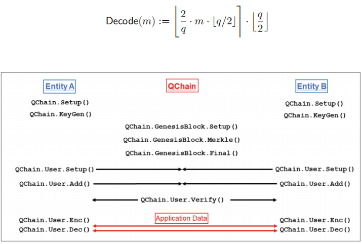 图1显示全部架构的QChain。我们使用ring-LWE加密方案去抵御量子计算攻击者。更准确地说,公钥加密方案是基于Lyubashevsky等人的ring-LWE,对量子对手是安全的。