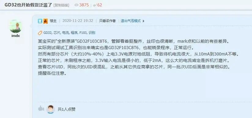 21IC网论坛网友imdx曾在2020年底发帖表示,某宝买的“全新原装”GD32F103C8T6,管脚看着挺整齐,丝印也很清晰,mark点和以前的有些差异。实际测试调试工具识别出来确实也是GD32F103C8T6,也能烧录程序,正常运行。