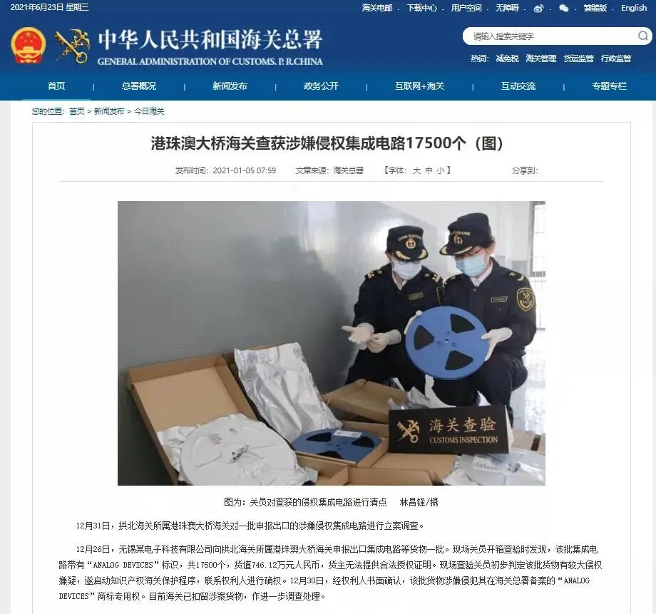 据中国海关总署官网2021年1月初通告,2020年12月26日,无锡某电子科技有限公司向拱北海关所属港珠澳大桥海关申报出口集成电路等货物一批。现场关员开箱查验时发现,该批集成电路带有“ANALOG DEVICES”标识,共17500个,货值746.12万元人民币,货主无法提供合法授权证明。