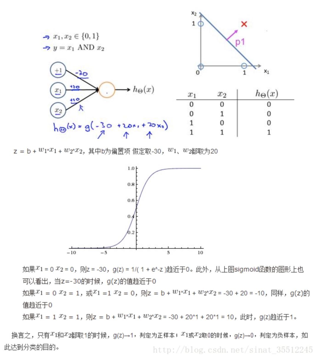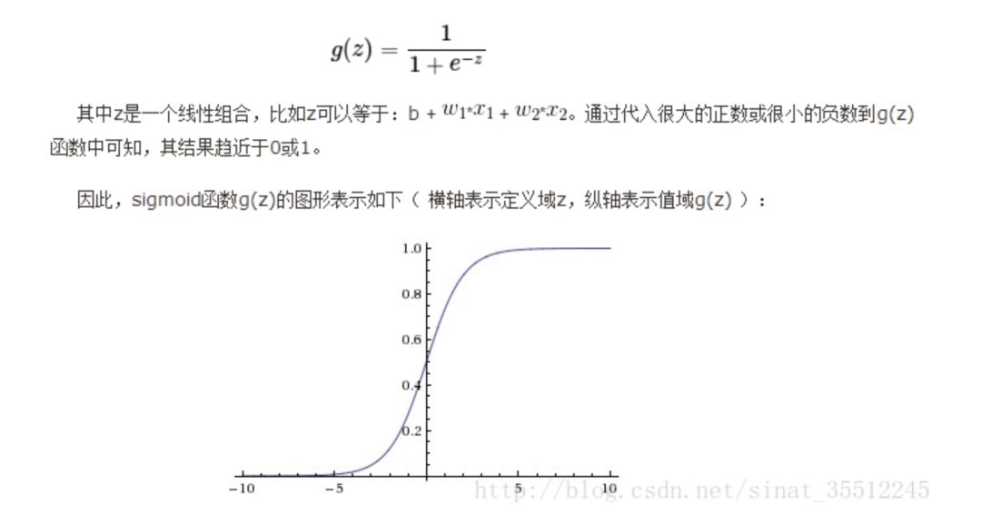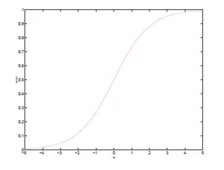其中x是n维特征向量,函数g就是Logistic函数。而:g(z)=11+e−zg(z)=11+e−z的图像是: