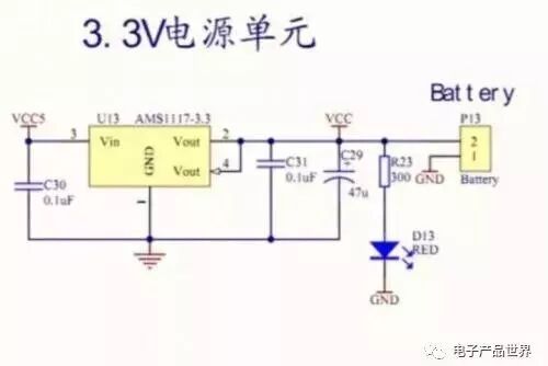 在右边又出现了一个VCC,我们可以判断出这个VCC所连接的导线上的电压是3.3V。C29是电解电容,它起到的是储能的作用。右下方的GND就是单片机的工作地了。来自VCC的3.3V电压通过R23和发光二极管D13,起到了电量指示的作用。最右边的是电池,我们不难看出,引脚2对应的是电池的正极——3.3V,而引脚1对应的是电池的负极——0V。当不存在外部电源供电时,2(电池正极)——R23——D13——GND——1(电池负极)组成回路,使得D13起到了指示电池电量的作用。