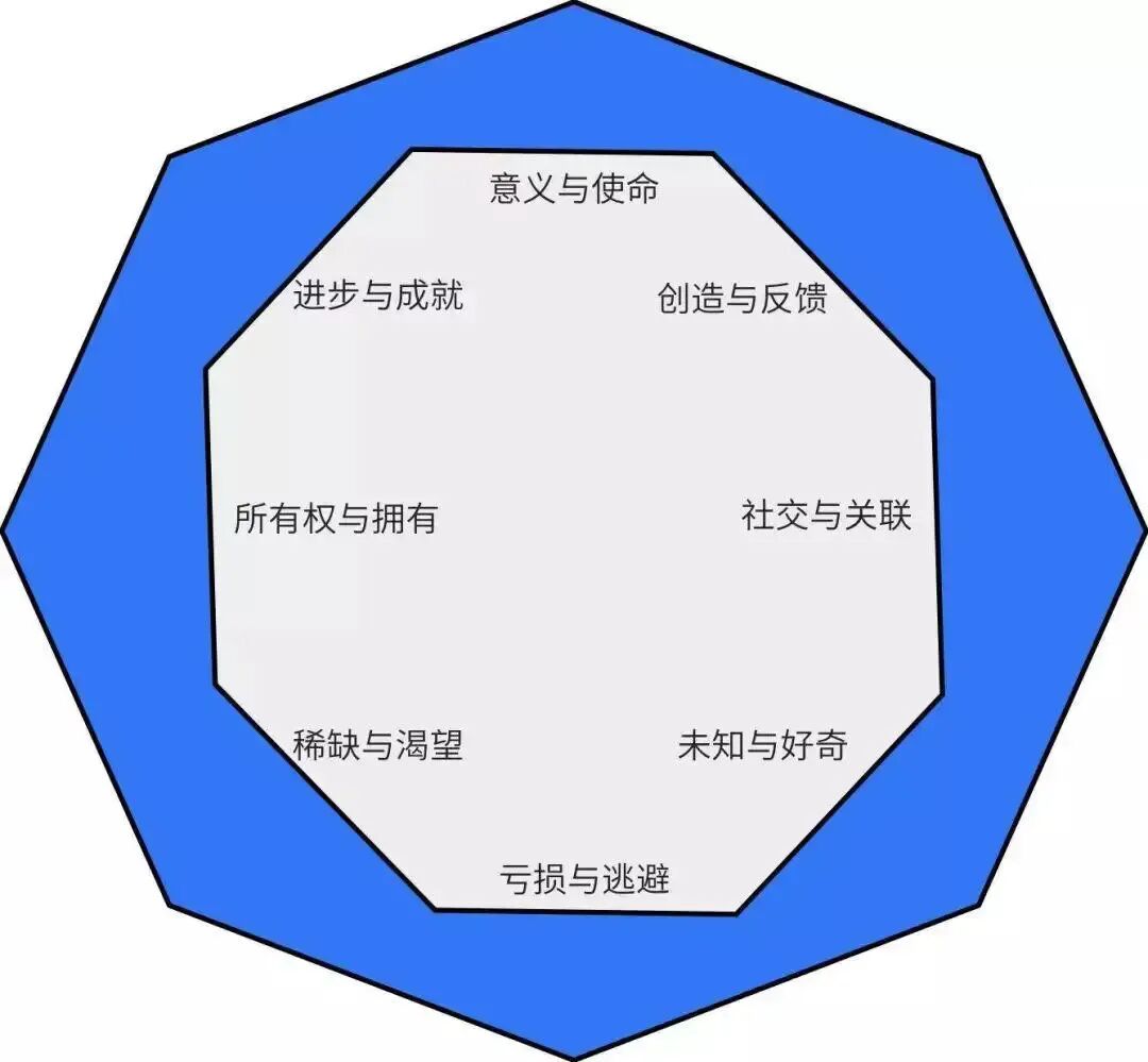 游戏之所以能够让玩家乐在其中,是因为他们做对了一些事情,例如游戏设计的八角模型就是在激发了人们产生行为的八种动机(如图所示):