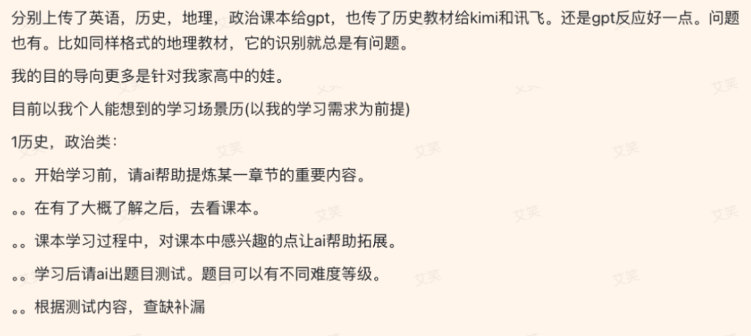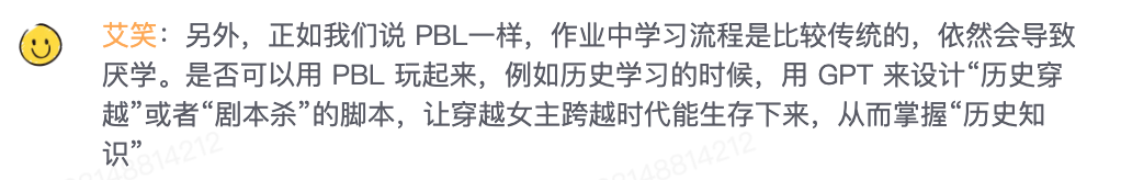 举一个例子:一位母亲在拆解学习流程,让孩子利用 AI 来进行学习历史时还是采用传统的教学方式,看起来很标准没有什么问题,但依然无法激发孩子的学习兴趣。在给到反馈启发后,家长就做了一个互动游戏式的提示词,虽然提示词的交互性还有待提高,但是相比传统模式而言很可能会让孩子产生兴趣,让孩子能够在游戏中玩起来,在玩中完成学习。