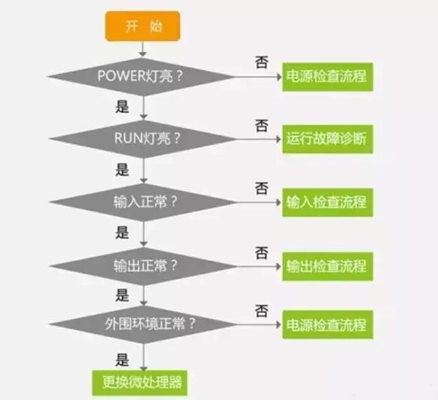 电源正常,运行指示灯不亮,说明系统已因某种异常而终止了正常运行,检查流程图如下图所示。