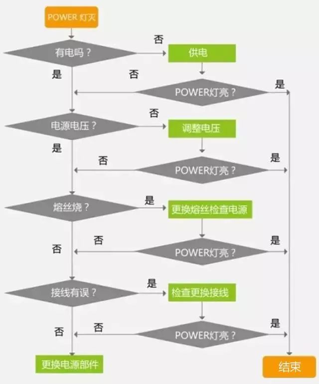 电源灯不亮需对供电系统进行检查,检查流程图如下图所示。