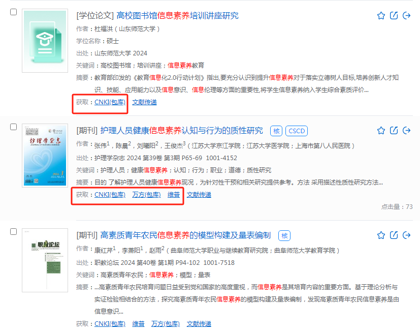 在图书馆主页统一检索平台输入待检索内容,点击检索可出现知网、万方和维普的相关文献,点击可直接链接到相应平台阅读和下载哦!