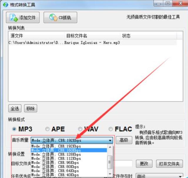 第三步:只需压缩歌曲文件大小的话,我们只需点击如图所示选项条,然后根据自己的需要选择文件大小,比如80kbps,一般来说,数字越小,文件越小,当然音质也越差,点击转换文件即可