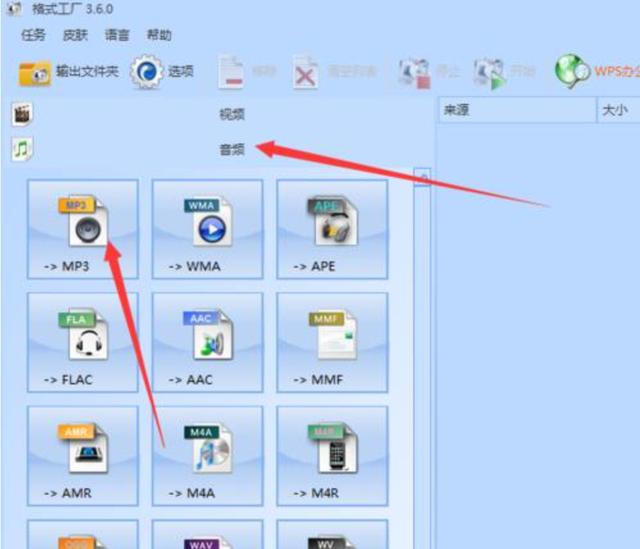 步骤1:我们打开格式工厂软件,然后选择音频,假如想要转换成mp3格式的话,我们点击选择mp3