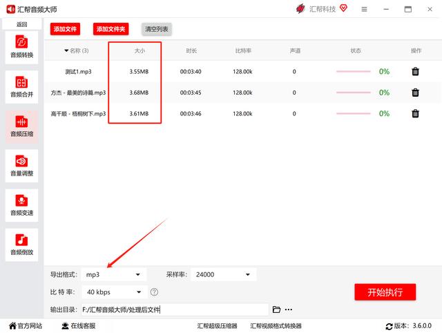 步骤5:点击右侧的“开始执行”按钮,软件将会自动开始对这些mp3进行压缩