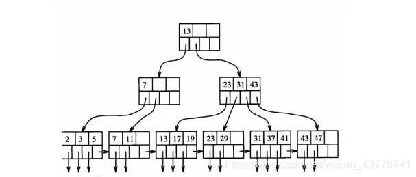 上图是一个 4 路 B + 树,可以清楚的看到,所有的数据都存放在叶子节点上,并且叶子节点之间有指针链表相连。