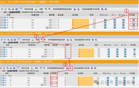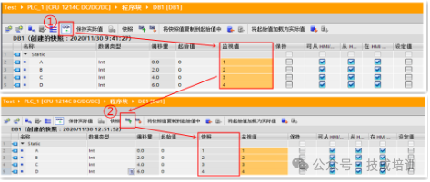 对于DB块中没有设置保持性的变量,当CPU停止并重新启动后,会使用新的起始值作为其监视值。具体的操作步骤可以参考图3中的说明。这样做可以确保在CPU重启后,所有的变量都能正确地使用新的起始值进行监控。