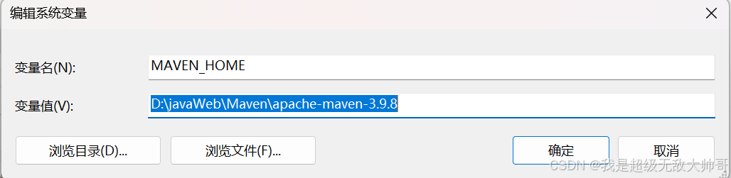 - 在环境变量中添加 变量,值为 Maven 的解压路径(例如 )。