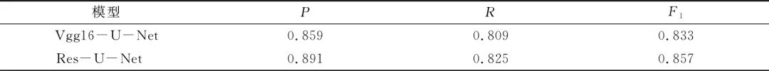 为验证对U-Net语义分割模型的改进效果,对比了原始的U-Net网络和改进后的Res-U-Net网络的表现,结果见表1.其中,精确率(P)定义为预测出的区域属于真实区域的比例,召回率(R)定义为预测出的区域中属于真实区域的比例,F1分数用于综合分析模型的召回率和精确率,其计算公式如下:
