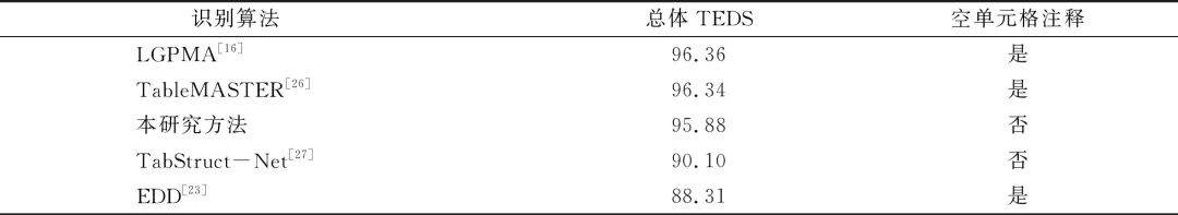 本研究没有针对文字内容识别方法进行研究,在识别文字内容时借助了开源的文字识别模型,受到该模型识别结果的影响,本研究的总体TEDS评分略低于表现**的2种方法,但所提出的表格结构识别方法一定程度上弥补了内容识别错误对总体TEDS评分的影响,对比其余部分方法仍有较大优势(表3).