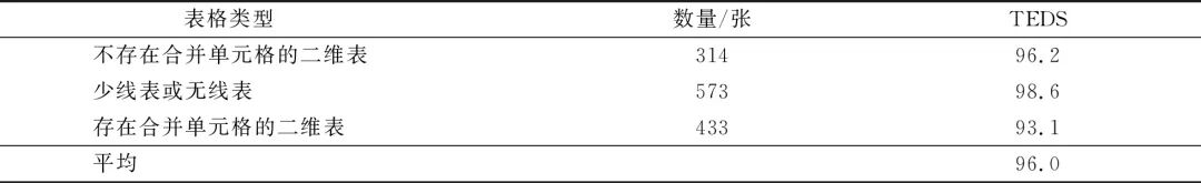 为验证本研究所提出的表格识别方法的性能,在本研究收集的1320张表格图像中添加了描述表格结构的HTML格式注释,同时将数据集中的表格图像按照表格类型分为不存在合并单元格的二维表(314张)、少线表或无线表(573张)、存在合并单元格的二维表(433张)3种类型.采用TEDS来衡量该方法在处理3种类型表格时的表现能力,具体结果如表2所示.