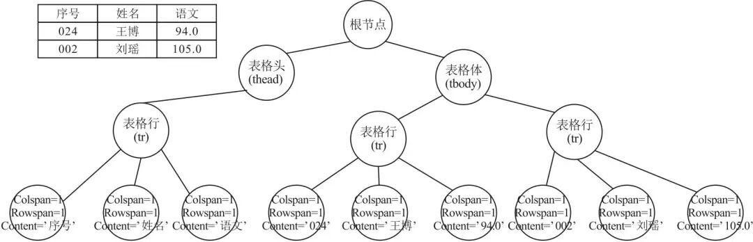 表格结构识别任务采用ICDAR 2021年竞赛的评价指标TEDS.TEDS采用树状结构表示表格结构(图8):树的根节点下有表格头(thead)和表格体(tbody)2个子节点,thead和tbody节点的子节点是表格行(tr),树的叶子节点是单元格(td),每个叶子节点包含行跨度(rowspan)、列跨度(colspan)和单元格内容(content)3种属性.