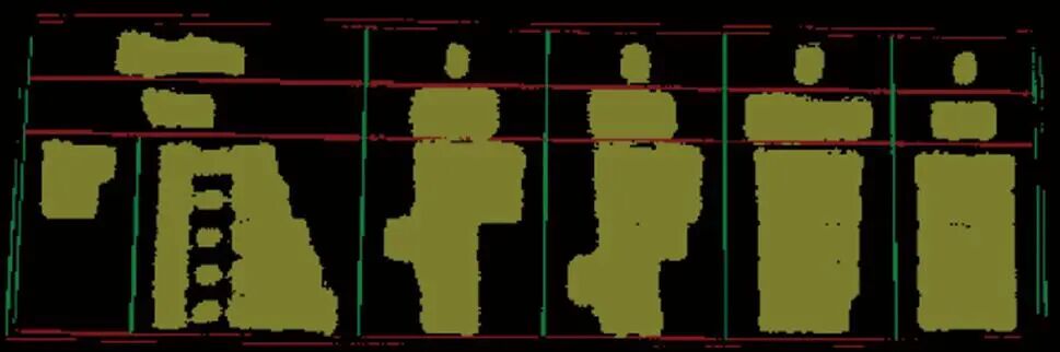 传统的图像直线检测算法通常基于霍夫变换实现,该方法会将过粗的表格线识别为多条直线.此外,由于文档图像可能拍摄于不受控的自然场景,导致表格线存在一定的弯曲,而霍夫变换无法识别该类型的直线.因此本研究使用深度学习方法,利用Vgg16-U-Net网络识别组成表格线的像素集合.但该方法分割得到的表格线像素点存在大量的断连情况(图2),分析其原因,由于表格中充满了大量的文字和文字间的空白,而构成表格的表格线属于相对细弱的目标,在网络较深时容易丢失信息,最终导致网络丢失其目标信息,分割出的直线信息不完整.