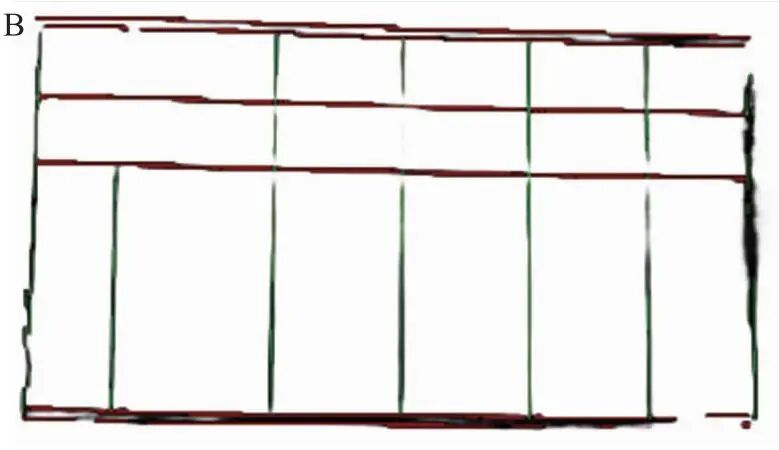 由于使用移动设备拍摄的图像中的表格线存在一定的弯曲,使用传统的方法无法获取直线信息.受到卷积神经网络卷积核滑动窗口思想的启发,本文采用滑动遮罩法,在网络输出的图像上创建滑动遮罩,将像素点信息进一步拟合为表格线信息.以处理横线像素点信息为例,具体拟合方式为:首先将该图片转变为单通道图片,只保留红色的像素点.然后在该图像中建立一个滑动的矩形遮罩,长度与图片长度相同,宽度为图片宽度的1/15,在每一个遮罩内提取属于横线的像素点的坐标,采用最小二乘法拟合出一条直线.完成一条横线的采集后,遮罩下滑,提取下一条横线.提取竖线的方式类似,遮罩变为宽度与图片宽度相同,长度为图片长度的1/20.提取到横线和竖线后,通过opencv中自带的函数来拟合矩形,进一步获得图片中的单元格坐标,结果如图7所示.