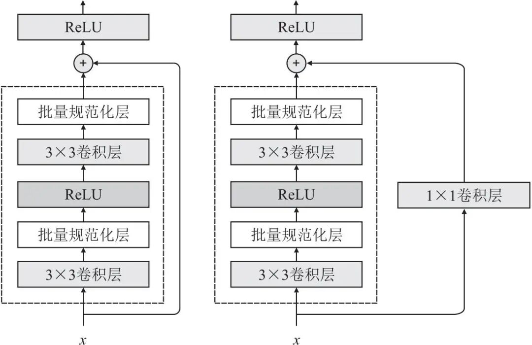 为解决网络层次过深导致的特征丢失问题,向每一个采样模块中引入残差结构,从而将网络早期的特征信息直接传输到网络更深的隐藏层中,使得构建深层次的神经网络成为可能.残差结构由2次卷积和1个残差连接路径组成,如图4所示,每个残差块有x和F(x) 2条路径,主要作用是拟合残差,可称之为残差路径;路径为恒等映射,也可以将其称为快捷连接(shortcut).依据残差路径是否改变了特征图的数量和尺寸,快捷连接的路径可以大致分为2种,一种是输入x原封不动地输出,另一种是通过1×1卷积来升高维度或者进行降采样操作,其主要目的在于保持输出与F(x)输出的特征图形状一致.具体的快捷连接结构如图5所示.