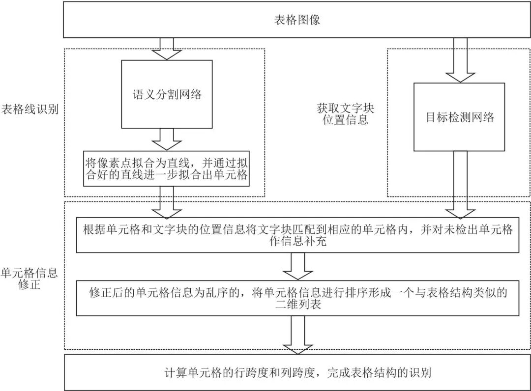 1)将表格图像分别送入语义分割网络和目标检测网络,得到表格线像素点信息和文字块信息.