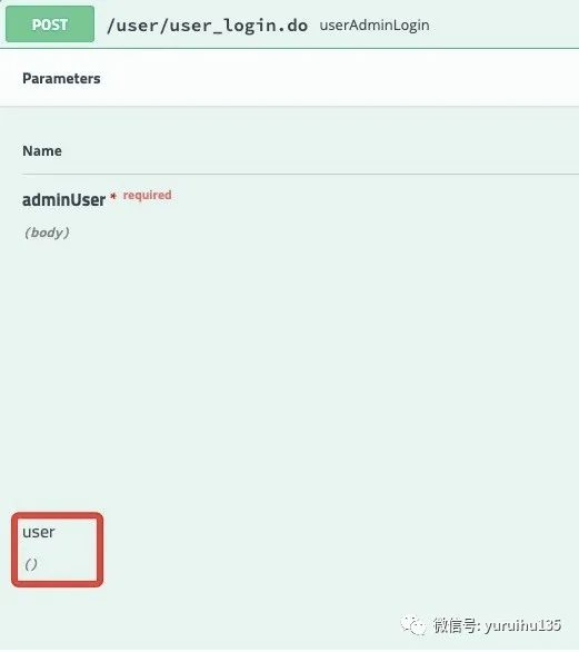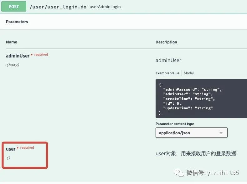 在我用红框圈起来的地方,我们可以看到在 user 的右上角有红色的 required 标识,这就是我们使用 required 规定参数必传的效果了。