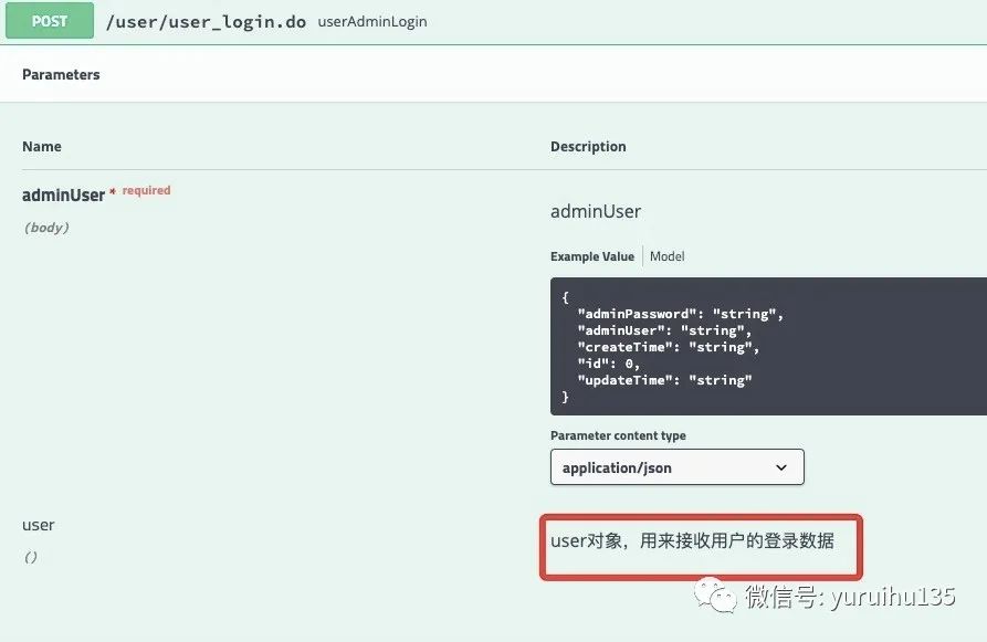 对于 defaultValue() 属性,该属性值的定义需要根据接口中参数的类型而定,比如该用户登录接口中的参数类型是一个 user 对象,所以我们在描述的时候应该把 defaultValue() 属性的值使用 json 来填充。
