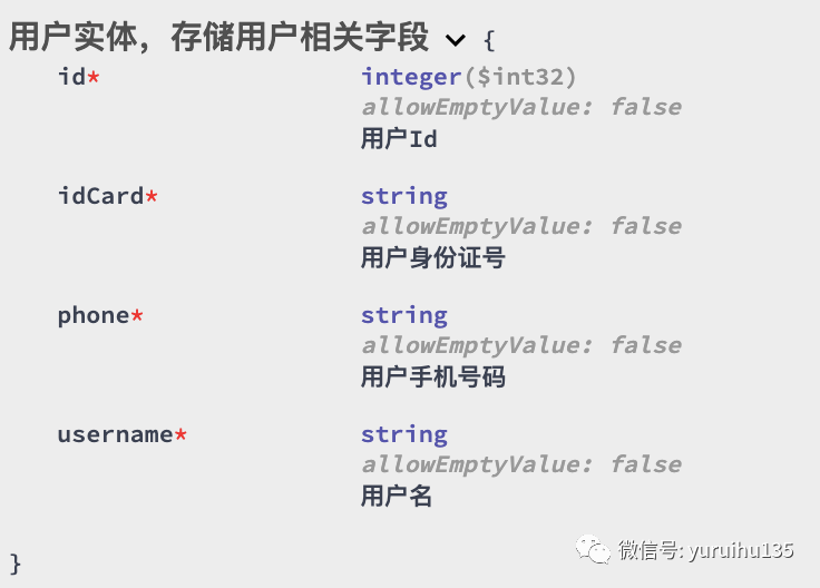 本节会结合一个用户操作相关的实体类,来给大家介绍 Swagger 中的两个关联注解 - ApiModel 注解和 ApiModelProperty 注解及所提供的常用属性,使用率较低或基本不适用的注解属性就不再介绍了。