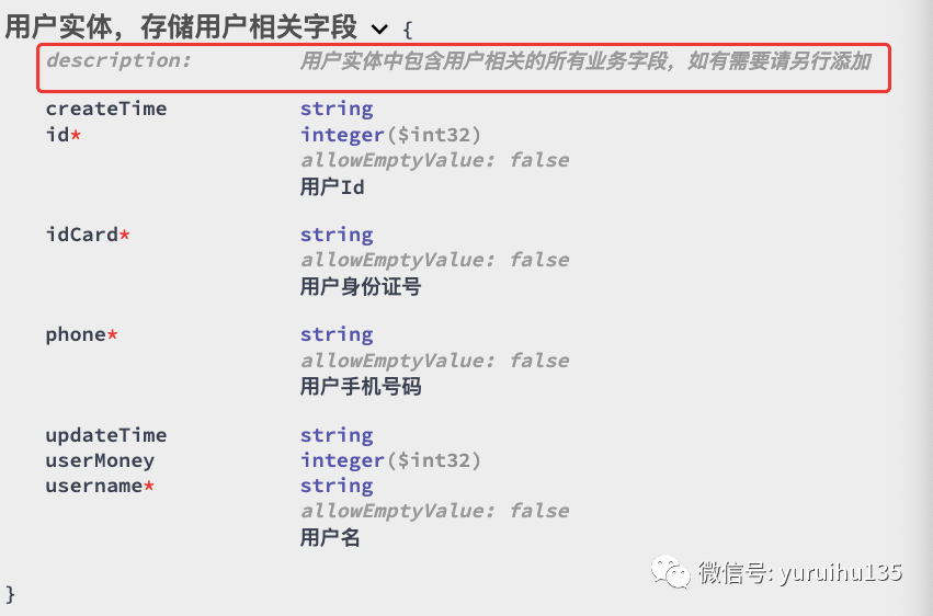 可以看到,在用红框圈起来的地方就是我们使用 description 属性来描述的信息了,值得注意的是,这里的显示样式是 Swagger 默认的,一般不需要修改。