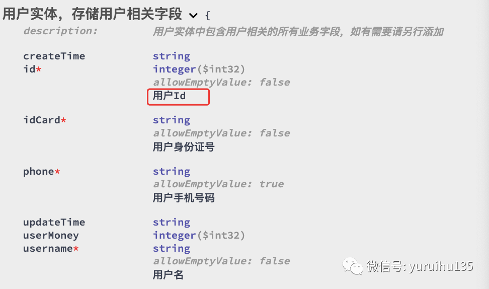 第1行,我们在 id 字段的上方定义了 ApiModelProperty 注解的 value 属性的值来对 id 字段补充说明。