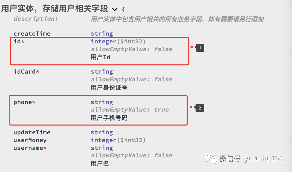 第1行,我们在 phone 字段的上方定义了 ApiModelProperty 注解的 allowEmptyValue 属性的值为 true ,代表该字段的值可以为空,在参数传递时可以不填充值。