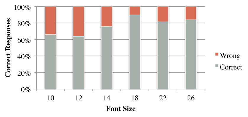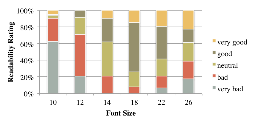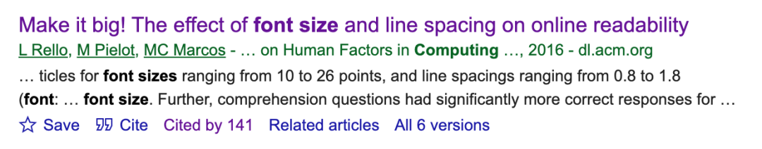 好在有篇2016年的论文,首次突破了14pt的限制,研究的字号范围够广从10pt到26pt的6种字号,这回应该够用了。而且被引用141次,在HCI人机交互这个领域也算不错了。