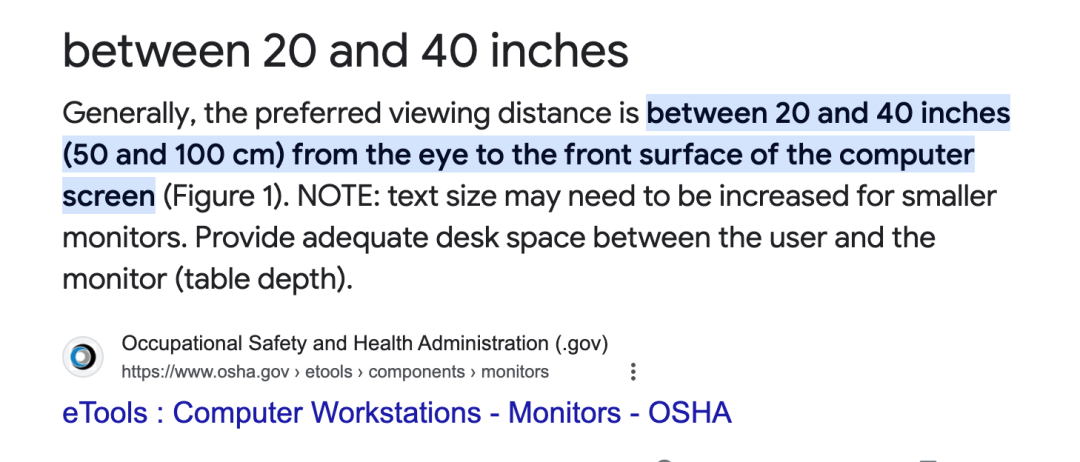 参考一下Google搜到的美国职业安全与健康管理局提供的建议,眼睛距离屏幕的距离要在50至100cm。这个距离是什么概念呢?170cm正常人的手臂长度一般65~75cm左右,可以用手臂来测量一下。